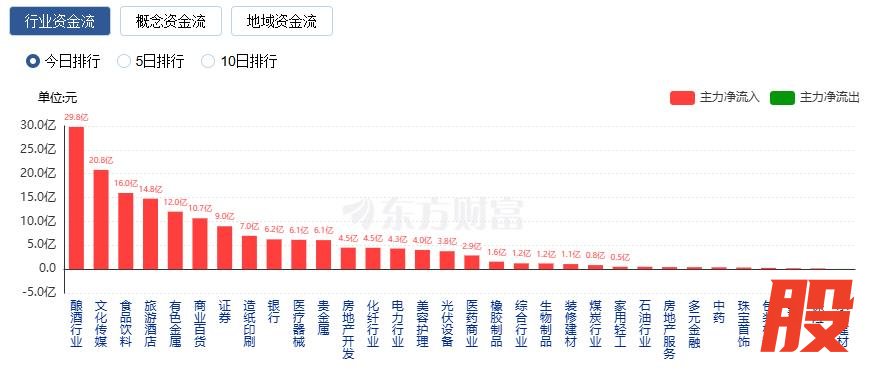 行业资金方面,截至收盘,酿酒行业、文化传媒、食品饮料等净流入排名靠前,其中酿酒行业净流入29.81亿。