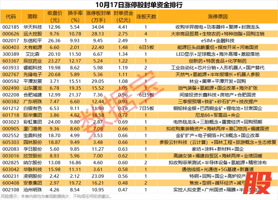 以封单金额计算,10股封单资金均超1亿元,华天科技、远大控股、东信和平封单资金居前,分别为4.41亿元、2.75亿元、2.49亿元。